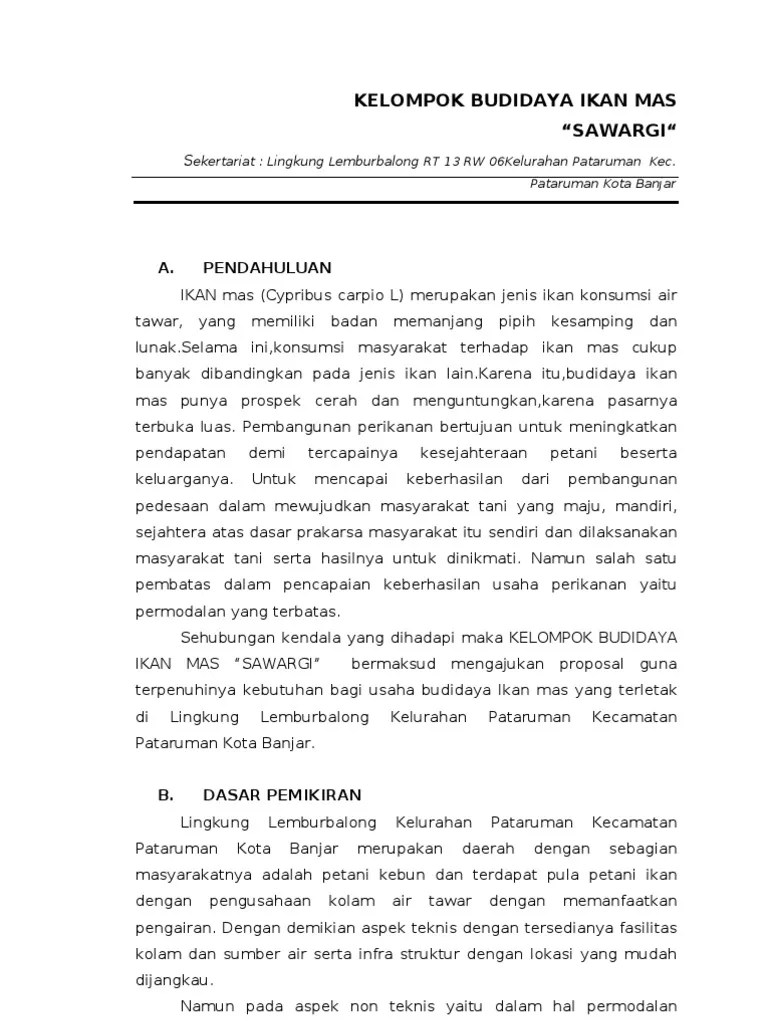 Dengan harapan proposal pengajuan bantuan dana serta . Untuk meningkatkan kesejahteraan petani, kelompok tani mina lestari mengadakan devertifikasi usaha di bidang perikanan salah satunya dengan budidaya ikan . Peraturan direktur jenderal perikanan budidaya. Proposal bantuan, rab dan ketentuan dalam kontrak serta. Selama ini anggota koperasi karya unggul pribumi mandfiri i telah melaksanakan aktifitas pembesaran ikan nila, lele, bawal, patin dan baung dan juga pembenihan . Proposal budidaya ikan air tawar. Proposal program kreativitas mahasiswa"usaha mikro budidaya ikan nila sebagai sumber pendapatan alternatif masyarakat. Contoh proposal budidaya ikan masdeskripsi lengkap. Tife skills berupa budidaya lele sebagaimana ditawarkan oleh direktorat jenderal perikanan budidaya'. Analisa keuntungan usahapembesaran ikan nila, bawal dan patin pembesaran nila, bawal dan patin mulai . Proposal usaha ikan nila posted in uncategorized with tags proposal usaha ikan nila on maret 25, 2011 by dedisafrizal i. Karena hasil analisisnya sangat lengkap dari awal hingga akhir dan tersusun rapi berdasarkan tata bahasa pembuatan proposal. Budidaya ikan nila yang menguntungkan peluang usaha rumahan.